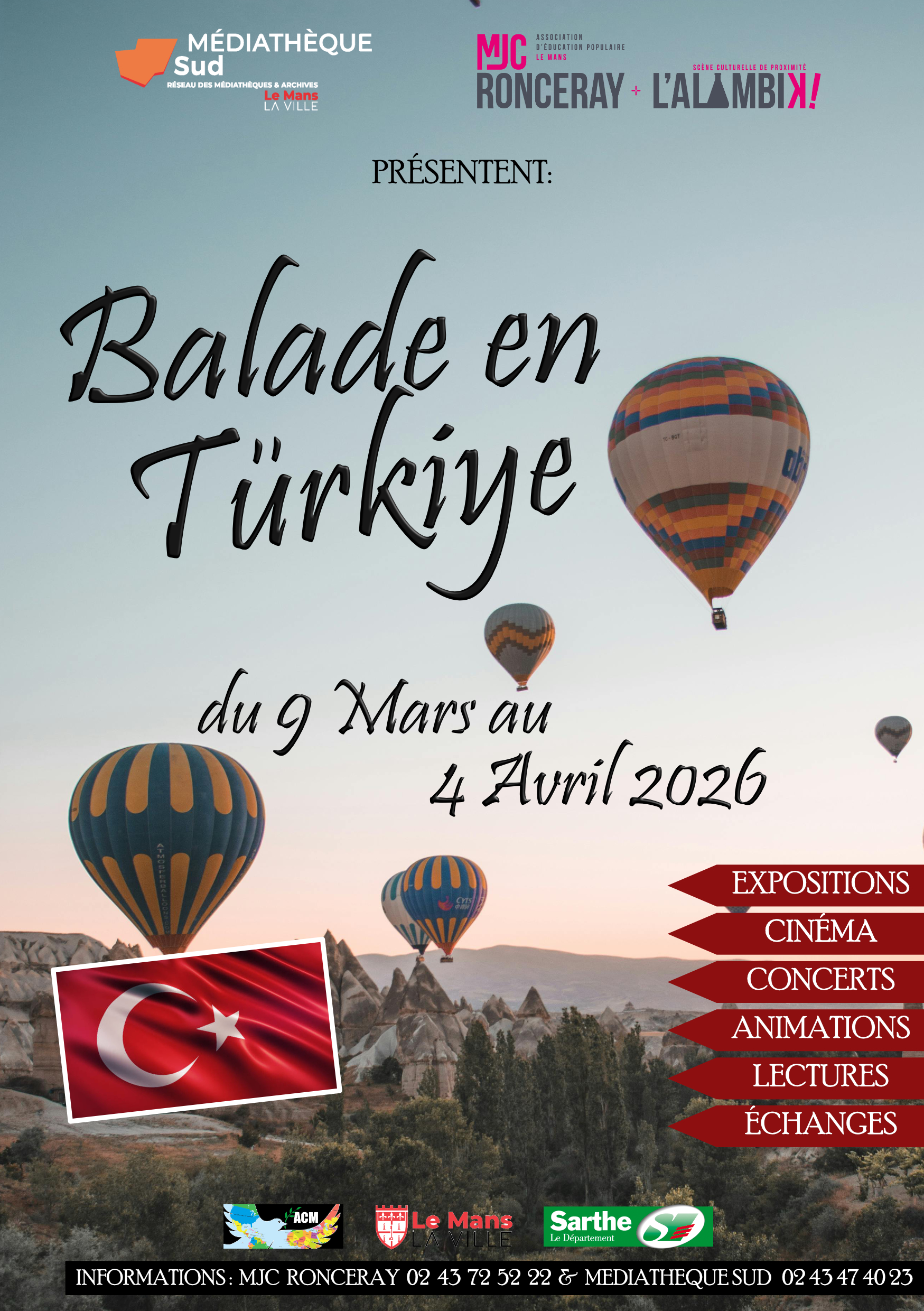 Accueil Evenement passés - MJC Ronceray - L'Alambik! Animations & Temps Forts BALADE EN TÜRKIYE ! Lieu Mjc Ronceray bd de la Fresnellerie, Le Mans Date 09 Mar 2026 - 04 Avr 2026 Heure 8 h 00 min - 18 h 00 min Labels TEMPS FORTS BALADE EN TÜRKIYE ! Partagez cet événement