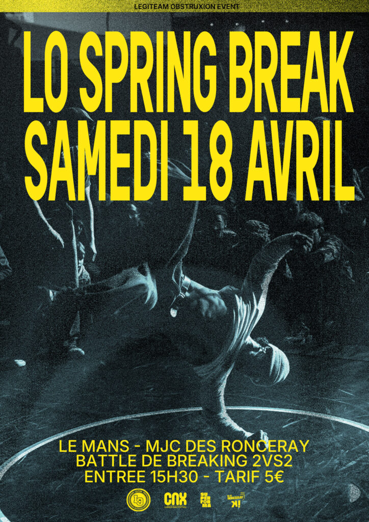Accueil Evenement passés - MJC Ronceray - L'Alambik! Musiques Actuelles & Cultures Urbaines LO SPRING BREAK – BATTLE BREAKING 2 VS2 Date 18 Avr 2026 Heure 15 h 30 min - 18 h 00 min Labels SPECTACLE LO SPRING BREAK – BATTLE BREAKING 2 VS2 Billetterie Weezevent Partagez cet événement